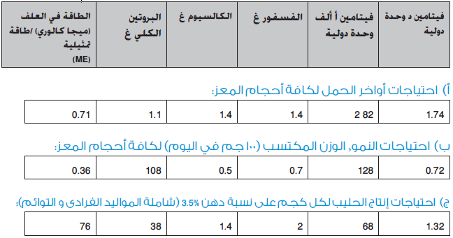 11- تقدم لها الأعلاف التالية اعتباراً من أول أيلول وحتى نهاية كانون الأول بواقع 300 جم من العلف المركز (% 13 بروتين )، 200 جم من دريس الفصة أو التبن وخمس ساعات رعي كحد أدنى.