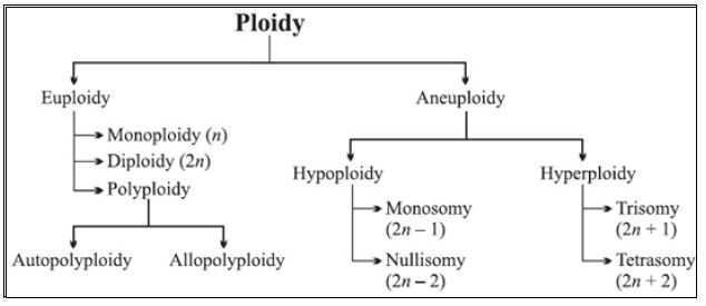 - زيادة عدد المجاميع الكروموسومية أي حصول حالة التضاعف العددي Poly أو فقدان أو اكتساب كروموسوم كامل منتجاً ما يسمى Monosomic أي التي ينقصها كروموسوم كامل أو Trisomic التي تحوي كروموسوم إضافي.