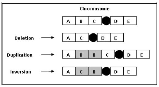 - ويمكن ان تحصل تغيرات تركيبية للكروموسومات مثل حذف قطعة من الكروموسوم أو انقلاب الكروموسوم أو التفافهُ. كما في الشكل الاتي :