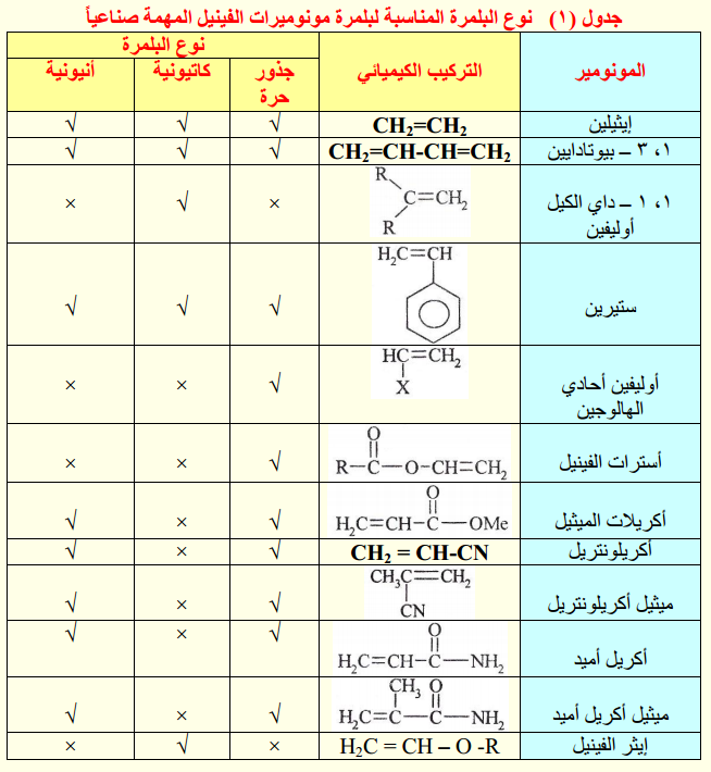 وبصورة عامة فإن معظم المونوميرات غير المعاقة فراغياً يمكن بلمرتها بواسطة الجذور الحرة. ويوضح الجدول (1) انوع البلمرة المناسبة لعدد من مونوميرات الفينيل المهمة تجارياً.