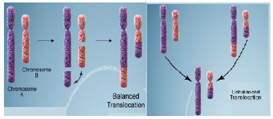 تشوه كروموسومي فيه يتم اقتطاع جزء من كروموسوم واقحامه في كروموسوم اخر غير متشابه وهذه ربما تؤدي الى دمج بعض الجينات التي كانت مفصولة وهي ظاهرة عامة في حالة السرطان . والانتقالات قد تكون معكوسة Reciprocal عندما يتم التبادل بين اثنين من الكروموسومات ، او يكون من نوع Robertsonian عندما يحدث اندماج بين اثثنين من الكروموسومات من نوع اللامركزية Acrocentric عند المركز وفقدان الاذرع القصيرة .