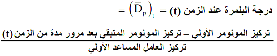 عندم يعتمد الوزن الجزيئي على زمن البلمرة، يمكن حساب درجة البلمرة بعد مرور زمن معين ((t وذلك بتعيين نسبة المونومر للتفاعل خلال الفترة الزمنية المعينة وحسب المعالة الآتية: