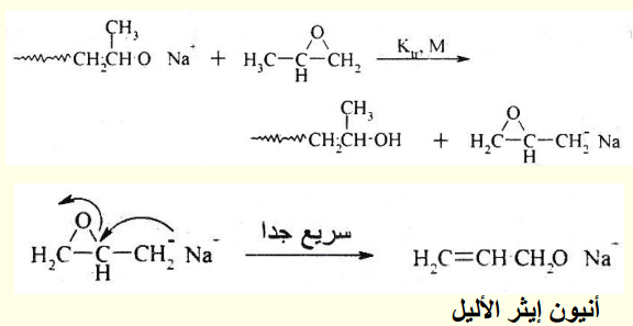 يكون عادة البوليمر الناتج من بلمرة الإيبوكسيدات منخفض في الوزن الجزيئي نسبياً أي أقل من (5000)، ونادراً ما يبلغ الوزن الجزيئي للبوليمر (10,000) وسبب ذلك قلة فعالية حلقة الإيبوكسيد تجاه المركز الفعال الآنيوني وحدوث تفاعلات انتقال السلسلة النامية إلى المونومر وخاصة إذا كان المونومر أكسيد الإيثيلين المعوض مثل اكسيد البروبيلين يتضمن تفاعل انتقال السلسلة النامية أخذ بروتون من مجموعة الألكيل المرتبطة بحلقة الإيبوكسيد بصاحبها وبسرعة انفتاح حلقة الإيبوكسيد وتكوين الإيثر الإليلي كما يلي: