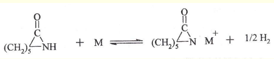 ولقد وجد أن استخدام القواعد الضعيفة لبدء التفاعل غير المفيد ، كالهيدروكسيدات والالكوكسيدات لأن ذلك يزيد تركيز الانيون المتولد في المحلول، وهذا يؤثر على حالة الاتزان ولكن عند استخدام الاميدات فإن الامونيا الناتجة يمكن إزالتها من التفاعل بسهولة، وبذلك يختل الاتزان ويتجه التفاعل إلى اليمين، ثم يتفاعل ايون اللاكتام (1) مع جزيئة اخرى من المونومر: