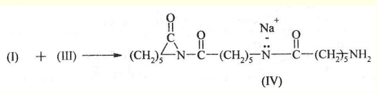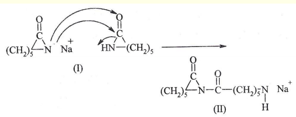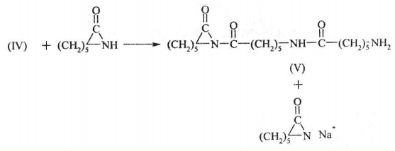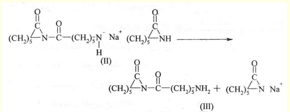 ان ايون الامين الاولي الناتج في المعادلة السابقة ((II يختلف عن أيون الكابرو لاكتام ((I فهو غير قادر على تثبيت نفسه لبعد مجموعة الكاربونيل عنه، لذلك يكون فعالاً جداً، وبإمكانه تجريد بروتون من المونومر بسرعة: