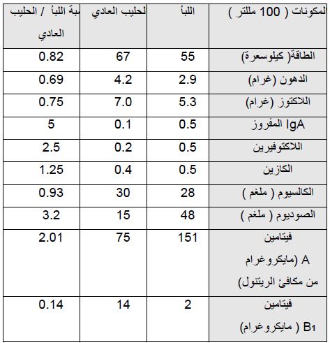 ويختلف تركيب اللبأ المنتج أثناء الأيام القليلة بعد الولادة بشكل كبير عن الحليب الناضج أي بعد حوالي 15 يوم من الولادة كما موضح في الجدول الآتي :