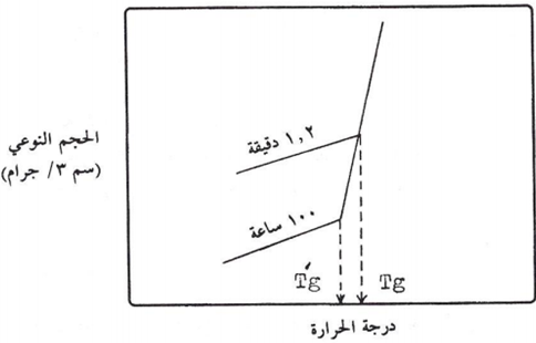 عند تعيين درجة الزجاج فإن القيمة المقاسة تختلف بالنسبة لمعدل عملية التبريد. فإذا تم تعيين درجة الزجاج بالتبريد التدريجي البطيء كانت درجة الزجاج المقاسة تقع عند درجة حرارة أقل من درجة حرارة الزجاج التي يتم تعيينها بمعدل تبريد اسرع كما يلاحظ من الشكل (1).