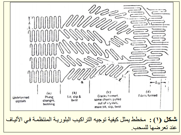 عند تعريض شريط من البوليمر إلى قوة سحب فإن السلاسل البوليمرية المتوزعة في هذا الشريط بشكل عشوائي غير منتظم تنتظم باتجاه محور السحب وبذلك تتكون نوع من التراكيب البلورية المنتظمة وهذه من الظواهر المألوفة في بعض أنواع المطاط. أما عندما يكون البوليمر حاوياً على تراكيب بلورية منتظمة وعند تسليط قوة سحب عليها فإن هذه التراكيب البلورية ستنتظم وتتوجه باتجاه محور السحب وهذه العملية تؤدي بدورها زيادة درجة التبلور في البوليمر . إن هذه الطريقة متبعة على النطاق الصناعي في زيادة درجة البلورة في الألياف الصناعية والرقائق إذ يجري توجيه هذه التراكيب البلورية المنتظمة باتجاه محور الليف مما يزيد من قوتها ومتانتها. وتعرف هذه العملية بالتوجيه (orientation). يبين الشكل (1) كيفية توجيه هذه التراكيب باتجاه محور السحب.