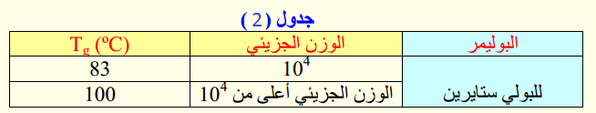 وقد وجد أن Tg للبولي ستايرين ذي الوزن الجزيئي (104) تبلغ (Tg = 83 C) ، غير أنها تبلغ (Tg = 100 C) عندما يكون الوزن الجزيئي عال جداً (جدول 14).
