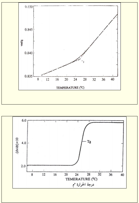 يستخدم لقياس الحجم النوعي اجهزة خاصة تدعى (dillatometers)، يمكن بواسطتها قياس التغير في الحجم بتغير درجة الحرارة. فعند درجة Tg يحصل تغير ملحوظ في الحجم النوعي للبوليمر. يمثل الشكل ادناه العلاقة بين التغير في الحجم النوعي ودرجة الحرارة فعند رسم العلاقة بين معامل التمدد الحراري (co-efficient thermal expansion) المستنتج من العلاقة الاولى وبين درجة الحرارة فيلاحظ ان هنالك تغيراً كبيراً وواضحاً عند درجة الانتقال الزجاجي للبوليمر .