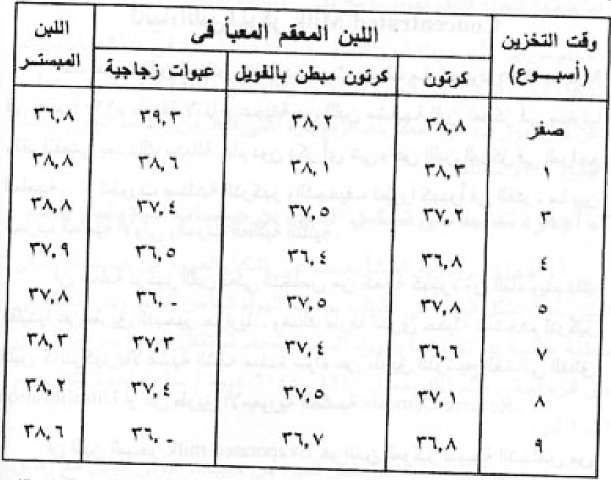 تقييم نكهة اللبن المعقم (137.8م) المخزن على 20 م لمدة تسعة أسابيع في عبوات مختلفة ومقارنة النتائج باللبن المبستر الطازج دائماً أي الغير مخزن. درجات التحكم من (40) درجة والدراسة أجريت في جامعة مريلاند الأمريكية*