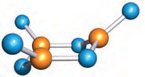 The solid state structures of La3[B3N6], La5[B3N6][BN3] and La6[B3N6][BN3]N show that the [B3N6]9- ion contains a six-membered B3N3 ring with a chair conformation (see below, B atoms are shown in orange). Each boron atom is in a planar environment, allowing it to participate in π-bonding to nitrogen.
