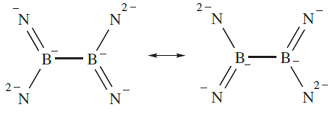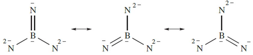 These nitridoborate compounds may be formed by heating (>1670 K) mixtures of powdered lanthanoid metal, metal nitride and hexagonal-BN, or by metathesis reactions between Li3BN2 and LaCl3. The ions [BN3]6-and [B2N4]8- are isoelectronic analogues of [CO3]2_ and [C2O4]2_, respectively. The B_N bonds in [BN3]6- are equivalent and diagram in below shows a set of resonance structures consistent with this observation. The bonding can also be described in terms of a delocalized bonding model involving π-interactions between N 2p and B 2p orbitals. Similarly, sets of resonance structures or delocalized bonding models are needed to describe the bonding in [B2N4]8- and [B3N6]9-.