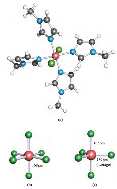 Fig. 1.1 Solid state structures (X-ray diffraction) of (a) trans-[SiCl2(MeIm)4]2 from the salt [SiCl2(MeIm)4]Cl2:3CHCl3 (MeIm = N-methylimidazole) [K. Hensen et al. (2000) J. Chem. Soc., Dalton Trans., p. 473], (b) octahedral [SiF6]2-, determined for the salt [C(NH2)3]2[SiF6] [A. Waskowska (1997) Acta Crystallogr., Sect. C, vol. 53, p. 128] and (c) trigonal bipyramidal [SiF5]-, determined for the compound [Et4N][SiF5] [D. Schomburg et al. (1984) Inorg.
