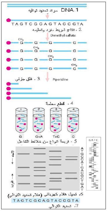 وDNA المراد تحديد تواليه يكون بشكل أشرطة مفردة ويعامل الشريط بإنزيم حل الفوسفات القاعدي Alkaline Phosphatase لإزالة الفوسفات عند النهاية ' 5 ثم يلي ذلك تعليم الشريط بالفسفور المشع وذلك بمفاعلته مع ATP حاوي على 32P وبمساعدة إنزيم فسفرة النيوكلوتيدات المتعددة Polynucleotide Kinase الذي يربط الفسفور المشع الى النهاية ' 5. ثم يتم تقسيم نموذج DNA المهيأ للتفاعل الى أربعة أقسام لتتم مفاعلة القواعد النتروجينية بالمواد الخاصة بها كما مذكور أعلاه فضلا عن إضافة Piperidine لفصم السلسلة عند القواعد المحورة. ثم يتم ترحيل كل نموذج في الهلام لتحديد مواقع القواعد النتروجينية في DNA كما موضح في الشكل :