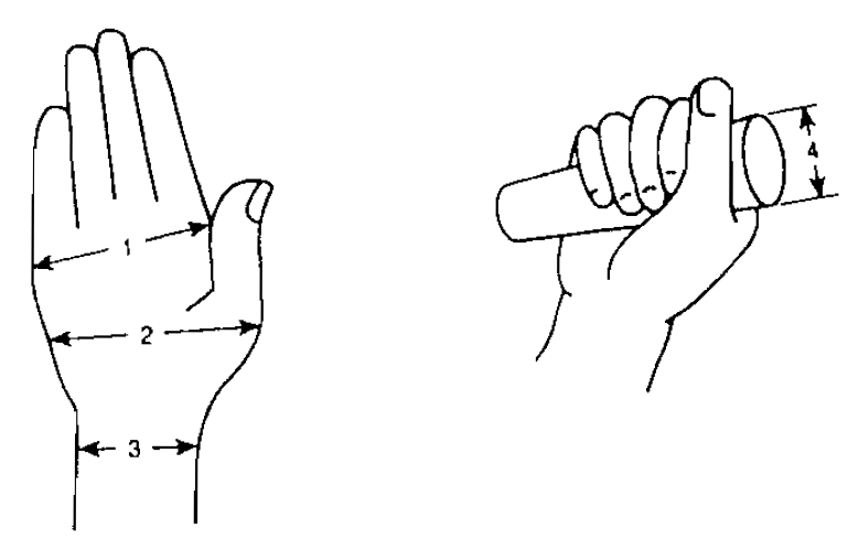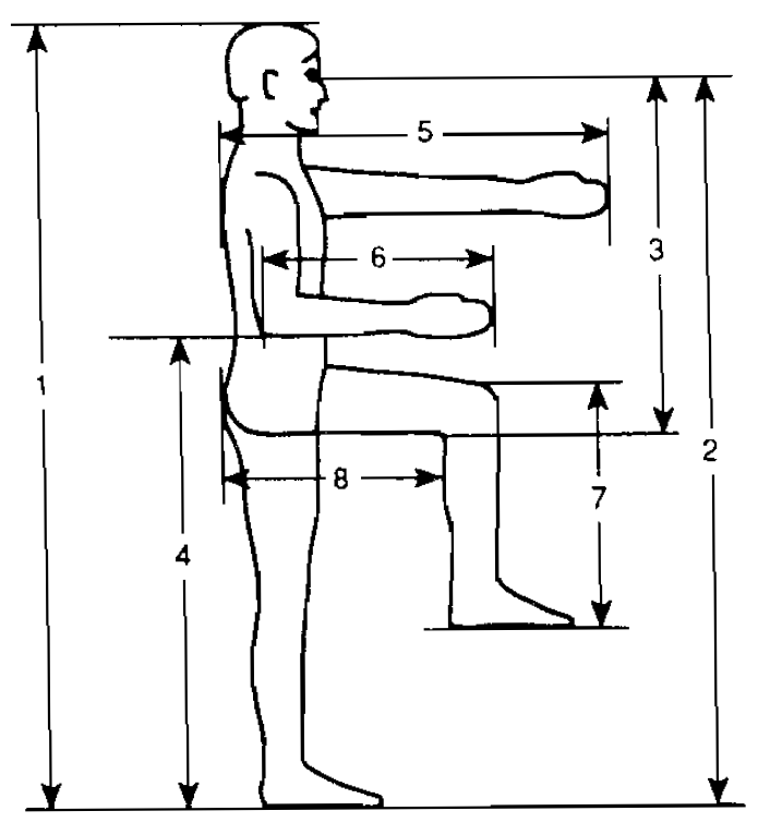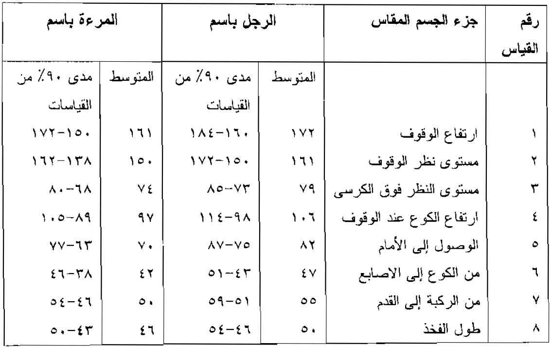 علم أبعاد جسم الأنسان يطلق عليه علم الأنثروبوميتري anthropometry .وجسم الأنسان يحتاج إلى أبعاد كثيره لتصفه وشكل (۷) يعطى أمثلة لمعظم الأبعاد وهي موضحه في جدول (3) "الذكور والإناث" وأبعاد اليد موضحة في شكل (۸) وجدول (4) طبقا للقياسات على الشعب الألماني وقد تختلف هذه الأبعاد من شعب إلى أخر ولذلك يجب أن تؤخذ هذه الأبعاد في الاعتبار عند استيراد الآلات أو تصميم ألات جديده ويجب أن تكون الآلات مناسبة لأبعاد ۹۰-۹۵ % من الشعب المستعمل لهذه الآلات.