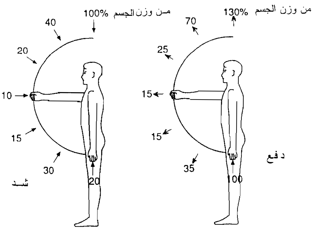 شكل (10) اكبر قوة يمكن للذراع شدها او دفعها وعلاقتها بزاوية الذراع "القوة كنسبة مئوية من وزن الجسم"