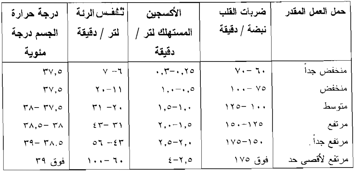 جدول رقم (5) العلاقة بين حمل العمل وضربات القلب ومعدل استهلاك الأكسجين ودرجة حرارة الجسم