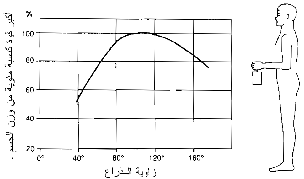 وتقدير قوة العضلات تعتبر من الأمور المعقدة وهناك أرقام يتم تقديرها لقوه زراع الأنسان وعلاقتها بزاوية الجسم شكل (9). وشكل (۱۰) ويجب أن يوضع في الاعتبار أن الالة التي تحتاج إلى مجهود أكبر من القدرة الموضحة في الأشكال لا يمكن أن تعمل أو سوف تعمل بكفاءة قليله وتحتاج إلى عماله غير عادية في القوة لتشغيلها.