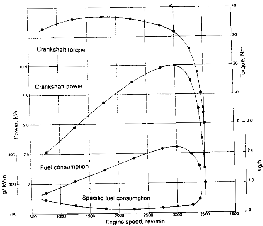 ويقاس استهلاك الوقود بالكيلو جرام / ساعة (kg/h) أو بالجرام / كيلو وات. ولا يجب أن يقاس الوقود بوحده الحجم بالنسبة للزمن (لتر / ساعة مثلا). حيث أن كتلة الوقود التي تحقن في المحرك تكون أهم العوامل التي تحدد القدرة التي يعطيها المحرك وتتأثر كثافة الوقود بدرجة الحرارة ولذلك فإن تقدير الوقود بالحجم يعطي نتائج غير دقيقه وخصوصا إذا كانت التقديرات أو المقارنات تتم في درجات حرارة مختلفة (صيف وشتاء) ويمكن قياس العزم وسرعة المحرك عند معدلات استهلاك مختلفة للوقود وبالتالي يمكن رسم منحنيات تبين العلاقة بين قدرة المحرك وسرعته والوقود المستهلك أو درجه حراره غازات العادم كما في شكل (4)