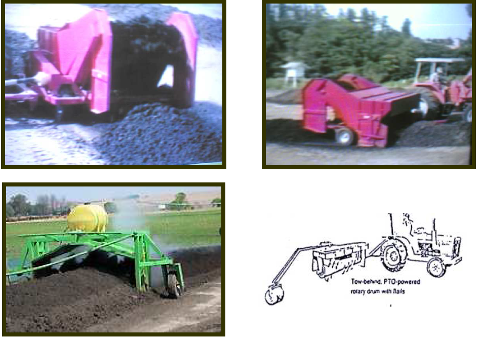 وهى آلات عملاقة تقوم بالتحرك على جانبي الكومة بحيث تكون الكومة في منتصفها ولها درفيلين لتقليب كومة الكومبوست في موقعها وهى تستخدم لتقليب الكومات الكبيرة الحجم ويوضح شكل ( 13 ) هذا النوع من آلات التقليب.