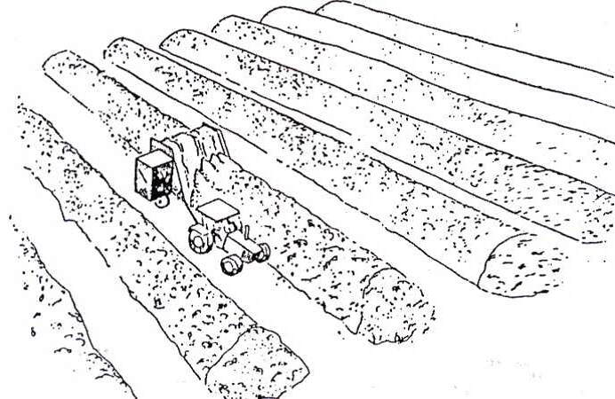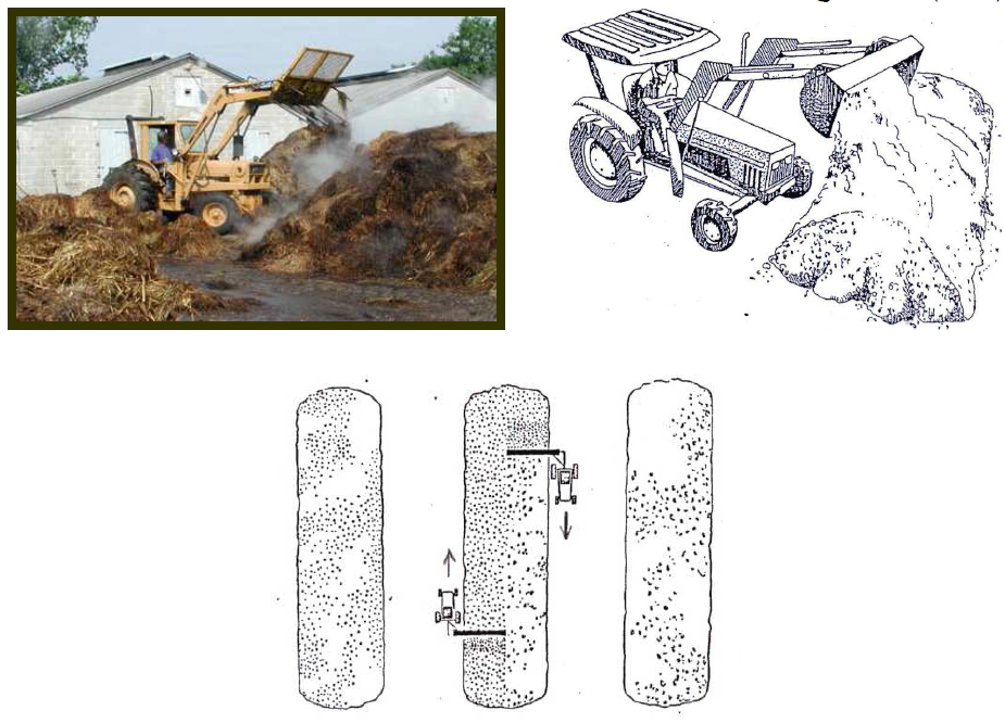 وهى لوادر تقوم بالتحرك على جانب الكومة الأيمن لتقليب نصف الكومة في موقعها ثم التحرك على جانب الكومة الأيسر لتقليب نصف الكومة الآخر في موقعها أيضا وبالتالي تقليب الكومة كلها ويوضح شكل ( 12 ) هذا النوع من معدات التقليب.