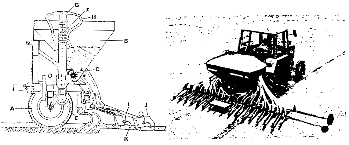 شكل (9) ألة زراعة ذات جهاز تلقيم بضغط الهواء A- عجلة الأرض B- خزان البذور C- جهاز التلقيم D- بذور تسقط خلال اختناق من أنبوبة الحقن E- تيار هواء منتظم من المروحة يحمل البذور F- أنبوبة النشر G- موزع على شكل عش الغراب H -أنابيب البذور المرنة I- سكاكين قرصية J- أجهزة تغطية k - فصلة للتوقفات.