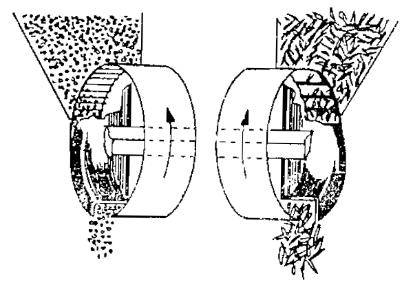 تستعمل أقراص البذور التي تحتوي على خلايا كبيرة ويسمح بامتلائها بمجموعة من البذور ولكن كثيرا ما يحدث بعثرة للبذور وخاصة على السرعات الأمامية العالية . وقد تتشتت البذور نتيجة لتأخر انسيابها من خلايا القرص ويمكن الحصول على مسافات أكثر دقة بين الجور وعدد متقاربة من البذور في الجورة الواحدة باستعمال عجلة نقل البذور وهذه العجلة تجمع العدد المرغوب فيه من البذور للجورة أثناء تصرفهم من قرص البذور ثم تنقلها على مقربة من قاع الأخدود على سرعة منخفضة بالنسبة للأرض شكل (10) وهناك نوع أخر من أجهزة التلقيم المجمع وهو الصمام الترددي ومع ذلك فإن الصمامات الدوارة تكون أكثر ملائمة للعمليات التي تتم على سرعات عالية، ويستعمل الصمام الترددي أساسا لزراعة الذرة بطريقة التلقيم المتقطع ويمكن استعمالها أيضا للتقليم المجمع.