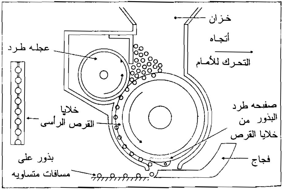 كثيرا ما تستعمل أجهزة تلقيم ذات أقراص رأسية دوارة كالمبينة في شكل (6) للزراعة الدقيقة وبعض الوحدات قد لا يوجد بها أنبوبة البذور وبذلك توضع الأقراص الدوارة أقرب ما يمكن إلى التربة حيث تسقط البذور مباشرة إلى الأخدود.