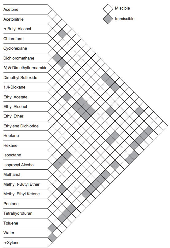 Solvent manufacturer Honeywell Burdick & Jackson defines solvents as miscibleif the two components can be mixed together in all proportions without forming two separate phases. A solvent miscibility chart (Figure 1.1) is a useful aid for determining which solvent pairs are immiscible and would therefore be potential candidates for use in LLE. More solvent combinations are miscible than immiscible, and more solvents are immiscible with water than with any other solvent. Solvents miscible with water in all proportions include acetone, acetonitrile, dimethyl acetamide, N,Ndimethylformamide, dimethyl sulfoxide, 1,4-dioxane, ethyl alcohol, glyme, isopropyl alcohol, methanol, 2-methoxyethanol, N-methylpyrrolidone, npropyl alcohol, pyridine, tetrahydrofuran, and trifluoroacetic acid.