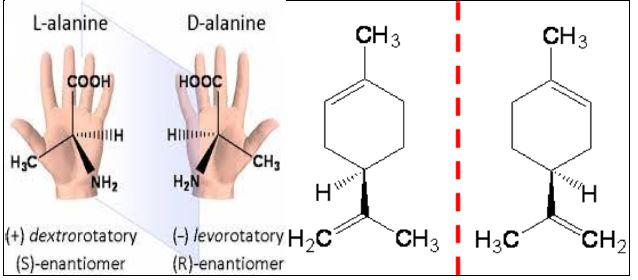 الجزيئات التي تكون احدها مرآة للأخرى كما في اللكنين ولكن غير متماثلة وتدور الضوء المستقطب بشكل متكافئ ولكن باتجاهات متعاكسة وتسمى ايضا Enantiomorph او Optical Isomers ، وتظهر التناظر المجسم Stereoisomerism نظرا لوجود اكثر من مركز اساسي Chiral Center :