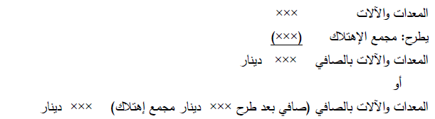 وهي أصول ملموسة تحتفظ بها المنشأة لاستخدامها في عمليات الإنتاج أو في توريد السلع والخدمات، أو لتأجيرها للغير، أو لاستخدامها للأغراض الإدارية والتي يتوقع استخدامها لأكثر من فترة مالية واحدة ., ومن أمثلة ذلك الأراضي، والمباني، والأثاث، والمعدات، والآلات. ويجب الإفصاح عنها مقرونة بمجموع الاهتلاك المتعلق بها كما يلي وعلى سبيل المثال :
