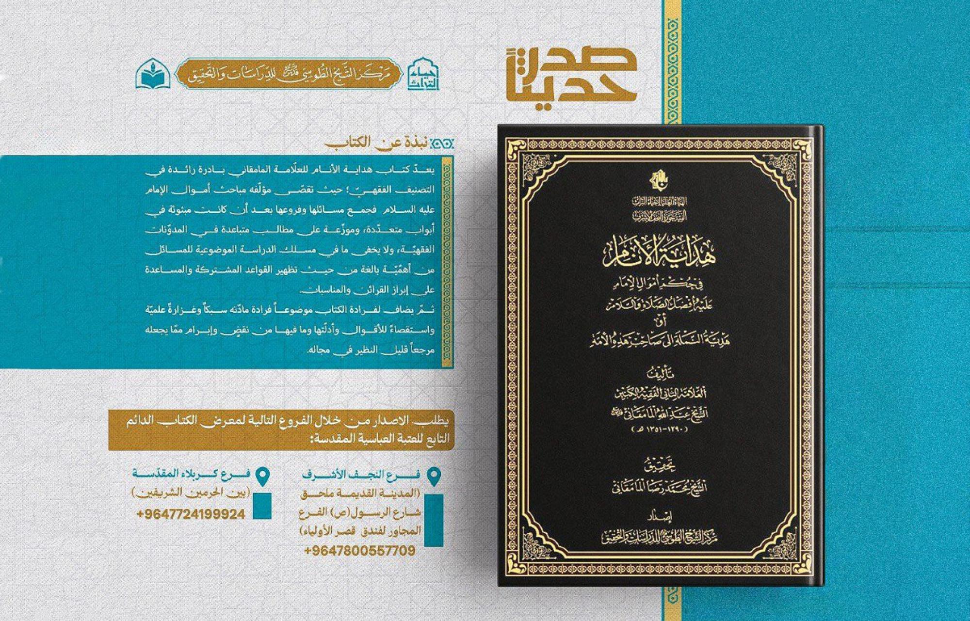 صدر حديثًا عن الهيأة العليا لإحياء التراث في العتبة العباسية المقدسة تحقيقًا عن كتاب (هداية الأنام في حكم أموال الإمام عليه أفضل الصلاة والسلام أو هديّة النملة إلى صاحب هذه الأمّة). وأشرف على إصدار التحقيق مركز الشيخ الطوسي للدراسات والتحقيق التابع للهيأة، وهو من تأليف العلّامة الثاني الفقيه الكبير الشيخ عبد الله المامقانيّ (قدّس سرّه) (1290-1351هـ) وتحقيق الشيخ محمد رضا المامقانيّ. ويُعدّ كتاب هداية الأنام للعلّامة المامقانيّ بادرة رائدة في التصنيف الفقهي، إذ تقصّى مؤلفه مباحث أموال الإمام (عليه السلام) فجمع مسائلها وفروعها بعد أن كانت مبثوثة في أبواب متعددة، وموزّعة على مطالب متباعدة في المدونات الفقهية، ولا يخفى ما في مسلك الدراسة الموضوعية للمسائل من أهمية بالغة من حيث تظهير القواعد المشتركة والمساعدة على إبراز القرائن والمناسبات.