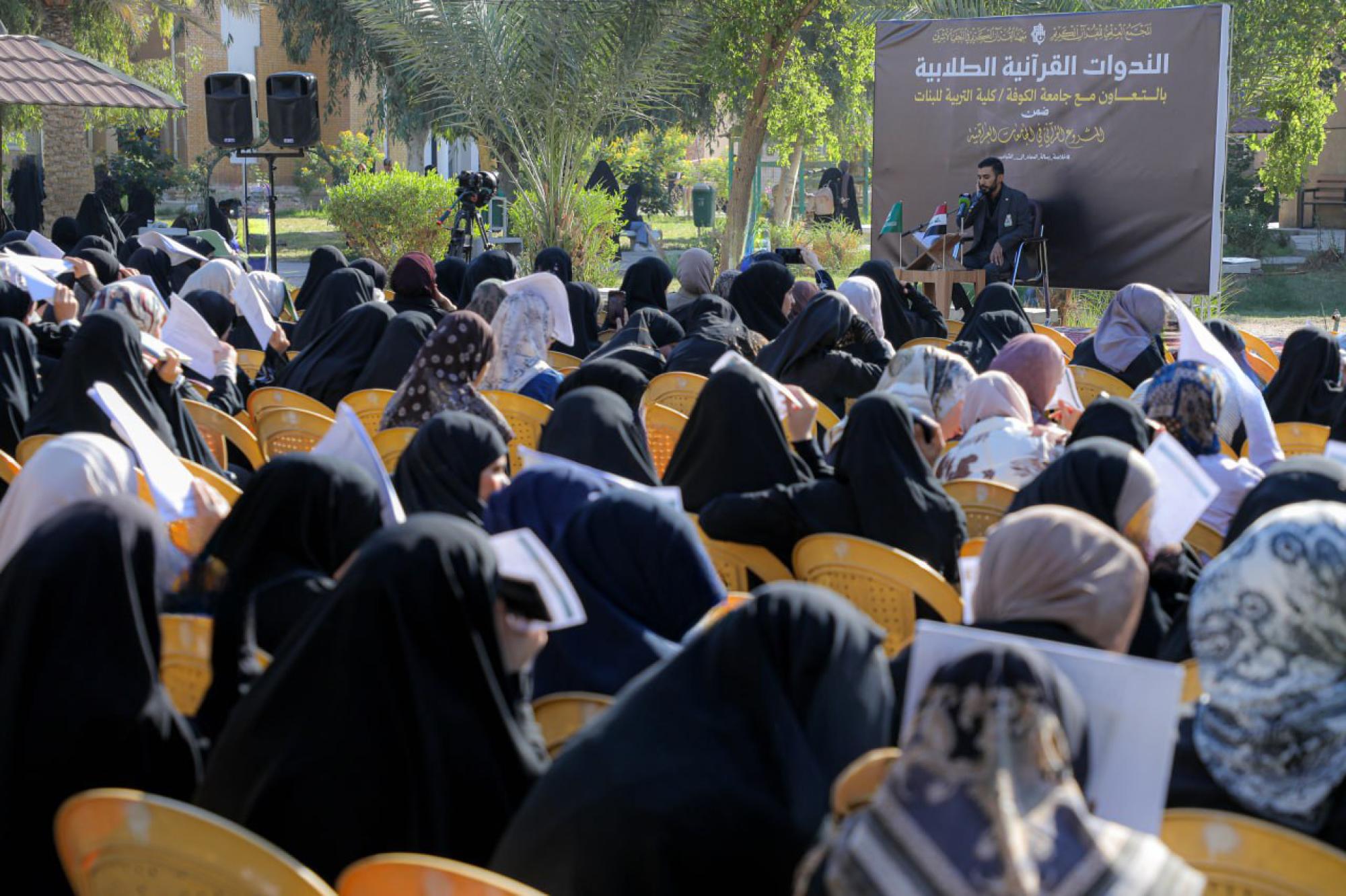 أقام المجمع العلمي للقرآن الكريم في العتبة العباسية المقدسة ندوة قرآنية لطالبات كلية التربية للبنات في جامعة الكوفة بمحافظة النجف الأشرف تزامنًا مع ذكرى شهادة السيدة الزهراء (عليها السلام). وأشرف على إقامة الندوة معهد القرآن الكريم في النجف الأشرف ضمن فعاليات المشروع القرآني في الجامعات العراقية بدورته السادسة للعام الدراسي 2025-2026، وبحضور 900 طالبة وعدد من ملاكات الجامعة التدريسية والإدارية. وقال مسؤول وحدة النشاطات في المعهد السيد الفضل عباس: إنّ الندوة استُهلت بتلاوة آيات من الذكر الحكيم بصوت القارئ علي الزبيدي، أعقبتها محاضرة قرآنية قدمها الشيخ زمان الحسناوي تحت عنوان (فقه الجامعيين). وأضاف أنّ المحاضرة تضمنت جملة من الأحكام والموضوعات الشرعية التي تمس حياة الطالبات الجامعيات، مبينًا مسؤولياتهن الدينية والأخلاقية داخل الحرم الجامعي، وكيفية التعامل مع التحديات اليومية وفق الرؤية الإسلامية، فضلًا عن التأكيد على أهمية الوعي القرآني والالتزام بالسلوك القويم في البيئة الأكاديمية.