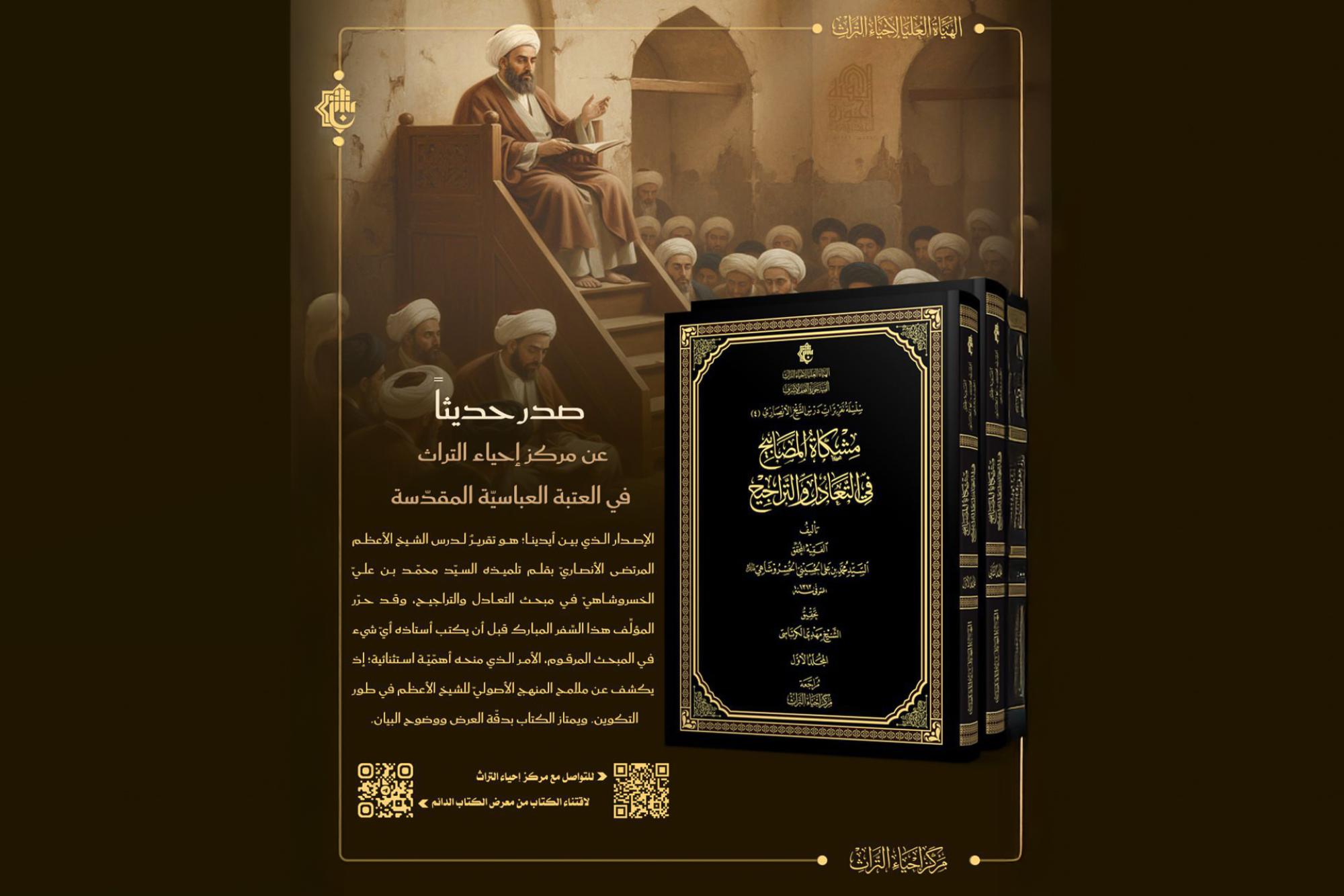 أصدرت الهيأة العليا لإحياء التراث في العتبة العباسية المقدسة ضمن سلسلة تقريرات درس الشيخ الأنصاري (قدّس سرّه) كتابًا بعنوان: (مشكاة المصابيح في التعادل والتراجيح). وتولّى إصدار الكتاب مركز إحياء التراث التابع للهيأة، وهو من تأليف الفقيه المحقّق السيّد محمّد بن علي الخسروشاهيّ (ت1312هـ)، وتحقيق: الشيخ مهدي الكرباسيّ. وقال معاون مدير المركز الشيخ ضياء الكربلائيّ: إنّ المؤلِّف حرّر الكتاب قبل أن يكتب أستاذه الشيخ المرتضى الأنصاري أيّ شيء في المبحث المرقوم، الأمر الذي منحه أهمّيّة استثنائية؛ إذ يكشف عن ملامح المنهج الأصوليّ للشيخ الأعظم في طور التكوين، ويعكس تفاعل تلامذته مع آرائه في تلك الفترة المفصليّة من تطور علم الأصول الإماميّ. وأضاف أنّ الكتاب يمتاز بدقّة العرض ووضوح البيان، مع لمسات نقديّة للمؤلِّف تُظهر نُضجه العلميّ واستيعابه العميق لأقوال الشيخ الأنصاري ومبانيه، كما ويتّضح للقارئ وجود التطبيقات الفقهيّة على مسائل هذا المبحث الأصوليّ.