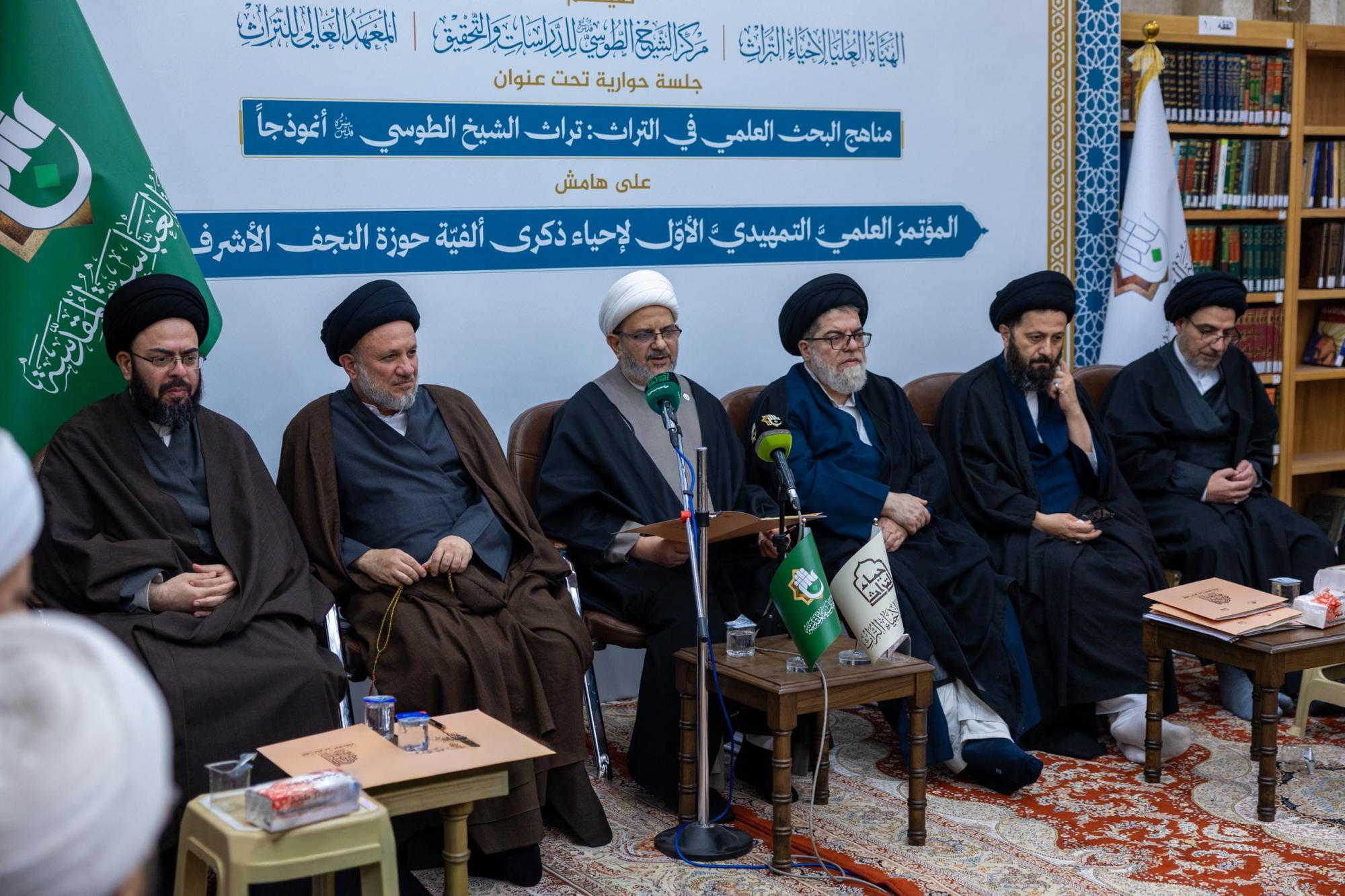 أقامت الهيأة العليا لإحياء التراث في العتبة العباسية المقدسة، جلسة حوارية عن تراث الشيخ الطوسي (قدس سره)، ضمن فعاليات المؤتمر العلمي التمهيدي الأول لإحياء ذكرى ألفية حوزة النجف الأشرف. ويقيم المؤتمر مركز الشيخ الطوسي للدراسات والتحقيق، والمعهد العالي لإحياء التراث التابعان للهيأة، بالتعاون مع جامعة الكفيل ومعهد البحوث الشيعية-تورنتو، تحت شعار (حوزة النجف الأشرف: 1000 عام من العطاء)، وبعنوان (تراث الشيخ الطوسي في الفكر الإسلامي والغربي: مقاربات معاصرة)، ويستمر يومين. وقال مدير المعهد العالي الدكتور السيد عبد الحكيم الصافي: إنّ "الجلسة عُقدت بعنوان (مناهج البحث العلمي في التراث: تراث الشيخ الطوسي أنموذجًا)، بمشاركة مجموعة من فضلاء الحوزة العلمية في النجف الأشرف، إلى جانب باحثين من العراق وإيران ولبنان وبريطانيا وأمريكا وكندا وفرنسا وسويسرا"، لافتًا إلى أنّ "الجلسة هدفت إلى مد جسور التواصل بين الأصالة الحوزوية والمنهجية الأكاديمية الحديثة".