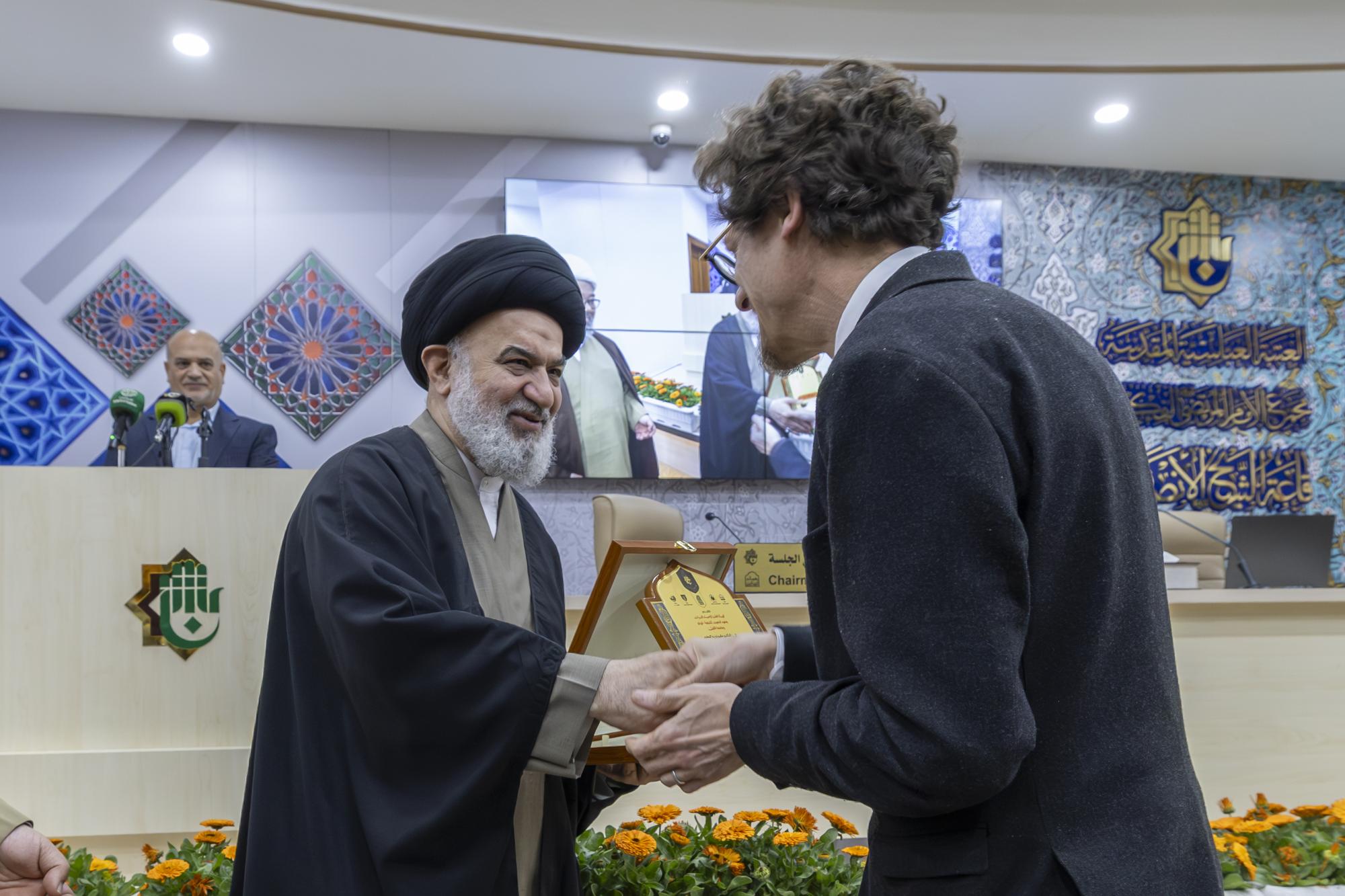 كرّم المتولّي الشرعيّ للعتبة العبّاسية المقدّسة سماحة العلّامة السيد أحمد الصافي، المشاركين في الجلسة البحثية الافتتاحية للمؤتمر العلميّ التمهيديّ الأوّل لإحياء ذكرى ألفية حوزة النجف الأشرف. ويُقِيم المؤتمرَ مركزُ الشيخ الطوسيّ للدراسات والتحقيق، التابع للهيأة العُليا لإحياء التراث في العتبة المقدّسة، بالتعاون مع جامعة الكفيل ومعهد البحوث الشيعيّة – تورنتو، تحت شعار (حوزةُ النجفِ الأشرف: ألفُ عامٍ من العطاء) وبعنوان (تراث الشيخ الطوسي في الفكر الإسلاميّ والغربي: مقارباتٌ معاصرة) في مجمّع الإمام المرتضى (عليه السلام) التابع للعتبة العبّاسية المقدّسة في النجف الأشرف. وشمل التكريم رئيسَ الجلسة الشيخ الدكتور حيدر السهلاني، والباحثَينِ سماحة السيد محمد جواد الشبيري الزنجاني أستاذ البحث الخارج في حوزة قمّ المقدّسة، والباحث الدكتور ماتيو تيرين مدير الدراسات في المدرسة التطبيقية للدراسات العُليا جامعة باريس للعلوم والآداب في فرنسا.