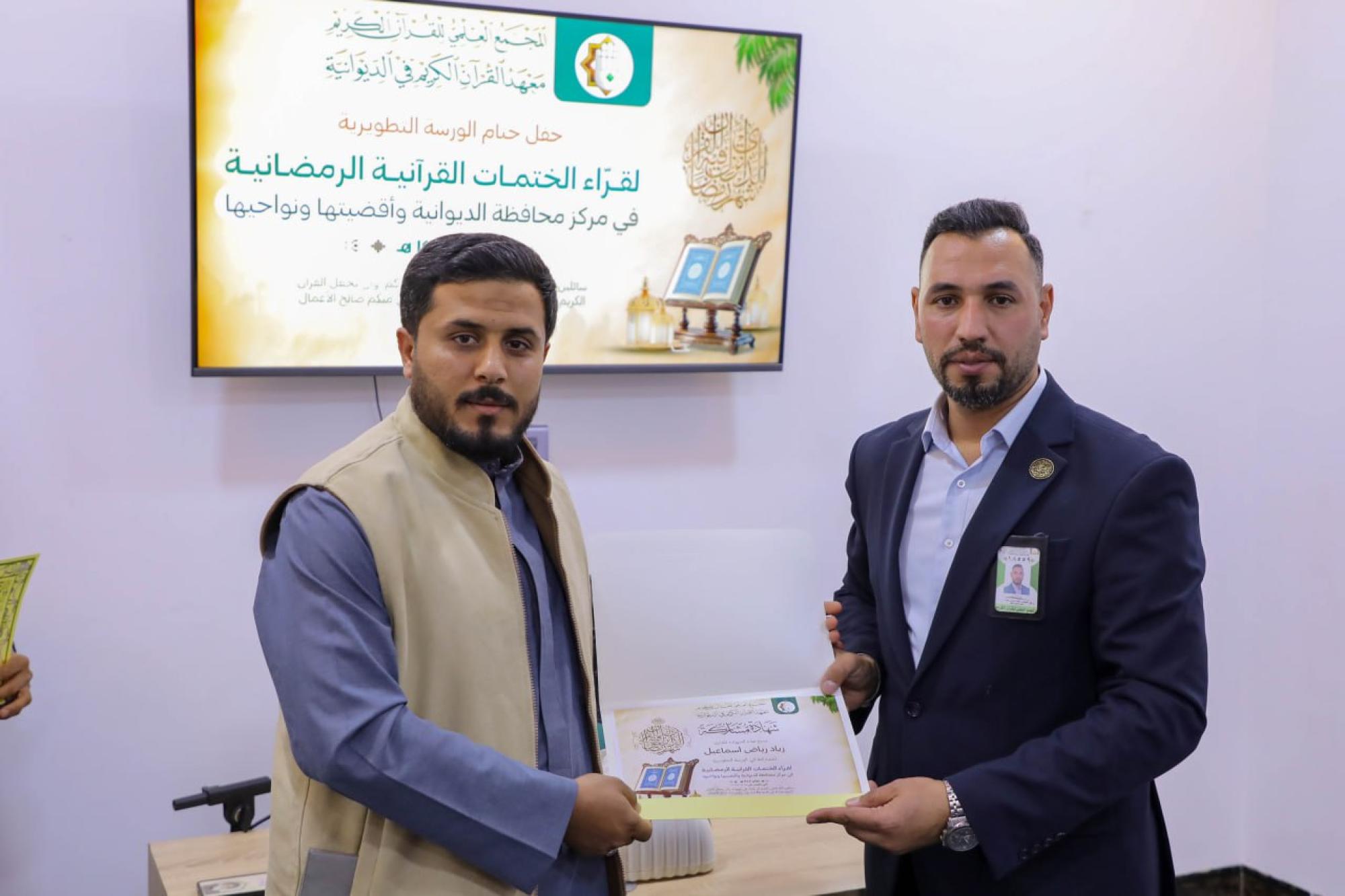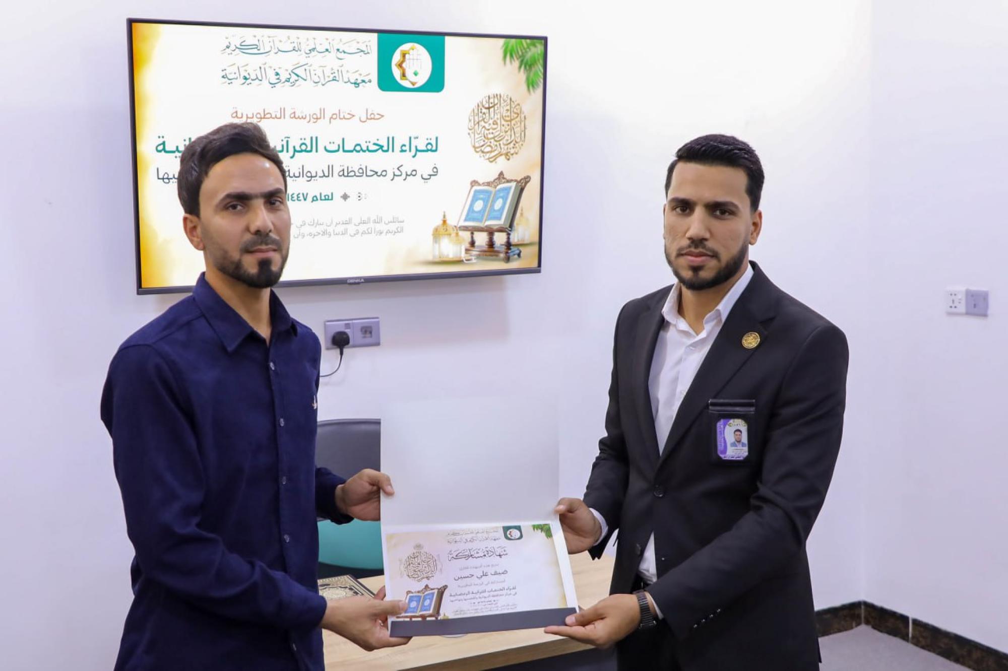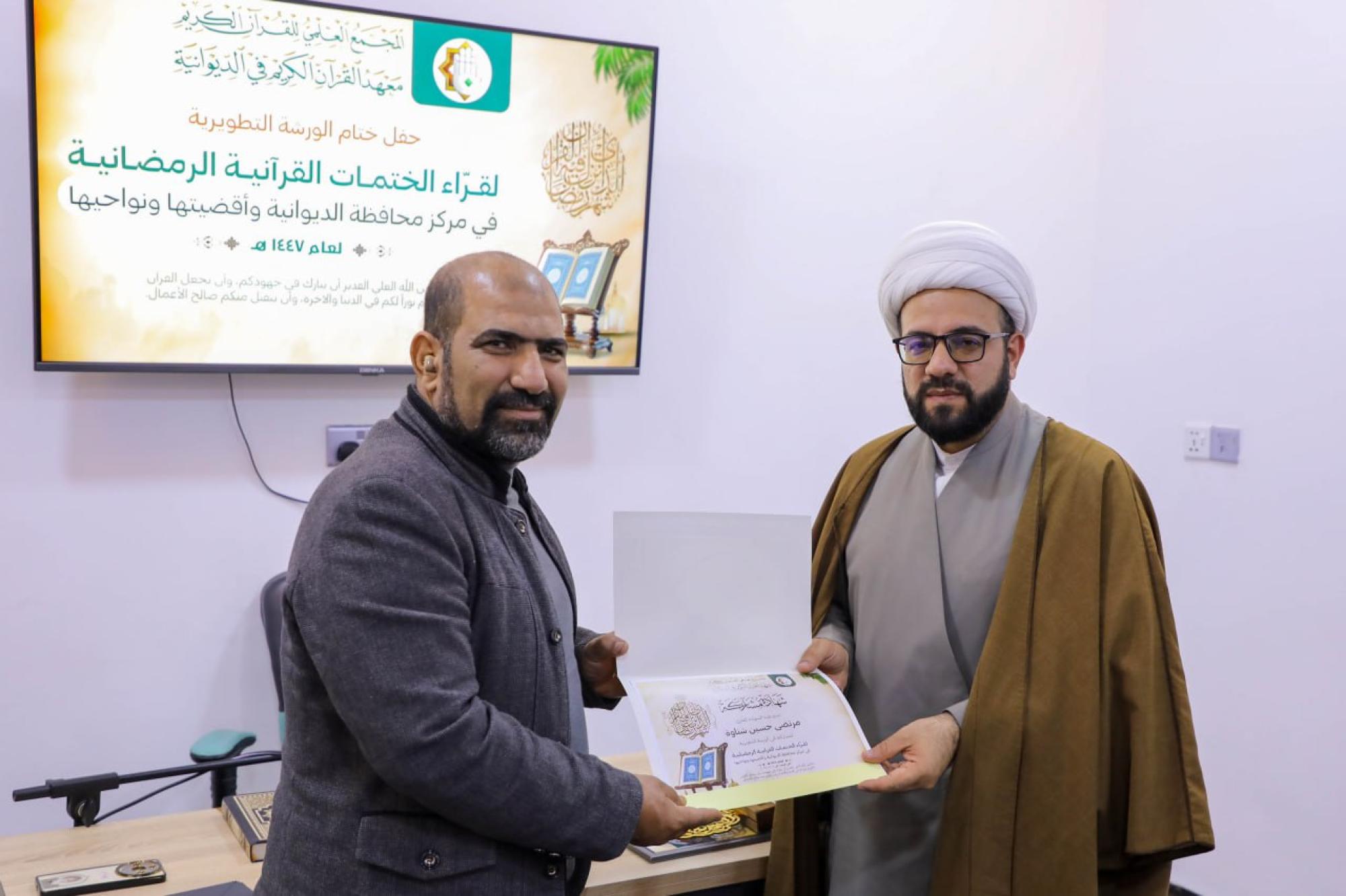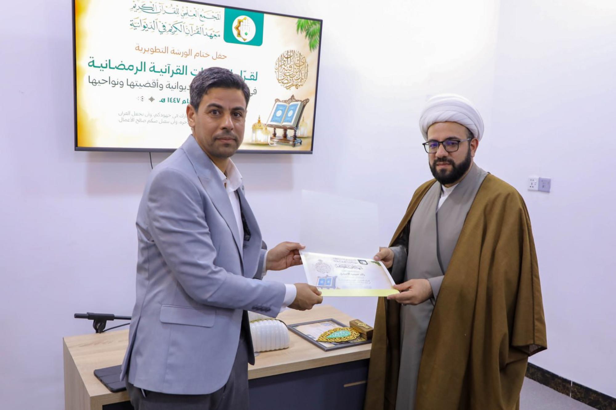 أقام المجمَع العلمي للقرآن الكريم في العتبة العباسية المقدسة ورشة تطويرية لقرّاء القرآن الكريم وبرنامجًا تبليغيًّا في 11 محافظة عراقية استعدادًا لشهر رمضان. وقال مسؤول معهد القرآن الكريم في الديوانية، السيد خالد العبادي: إنّ المعهد أقام ورشة تطويرية لـ 25 قارئًا من مركز مدينة الديوانية وأقضيتها ونواحيها. وأضاف أنّ الورشة تضمنت محاضرتين تطويريتين، إحداهما في فن الإدارة القرآنية للختمات، قدمها المدرب القارئ حسين عزيز الدليمي، والأخرى تناولت البعد الروحي والنفسي للختمات القرآنية، قدمها الشيخ مهدي قلندر البياتي. وبيّن العبادي أنّ "الختمات القرآنية ستقام يوميًّا خلال شهر رمضان المبارك، إذ تتم تلاوة جزء من القرآن الكريم في كل جلسة، كما تتضمن فقرة مخصصة للأسئلة القرآنية، وتُختتم بتوزيع هدايا على الفائزين، من بركات مرقد أبي الفضل العباس (عليه السلام)". وأطلق معهد القرآن الكريم في النجف الأشرف البرنامج التبليغي القرآني الرمضاني (يبلّغون) في 11 محافظة عراقية، ضمن المشروع القرآني لطلبة العلوم الدينية بدورته العاشرة للعام 1447هـ. وقال مسؤول وحدة الشؤون الحوزوية القرآنية في المعهد الشيخ وسام السبتي: إنّ "البرنامج في هذا العام ركز على توسيع رقعة انتشاره، والوصول إلى مناطق أبعد، لتشمل المحافظات الآتية: بغداد، كركوك، صلاح الدين، ديالى، البصرة، ميسان، ذي قار، واسط، المثنى، الديوانية، ونينوى". وأضاف أنّ هذا البرنامج يأتي ضمن جملة من النشاطات والمشاريع التي يعمل عليها المعهد خلال الشهر الفضيل، إذ تستمر فعالياته حتى الليلة الحادية والعشرين من شهر رمضان المبارك، ليلة ذكرى استشهاد أمير المؤمنين الإمام علي بن أبي طالب (عليه السلام).