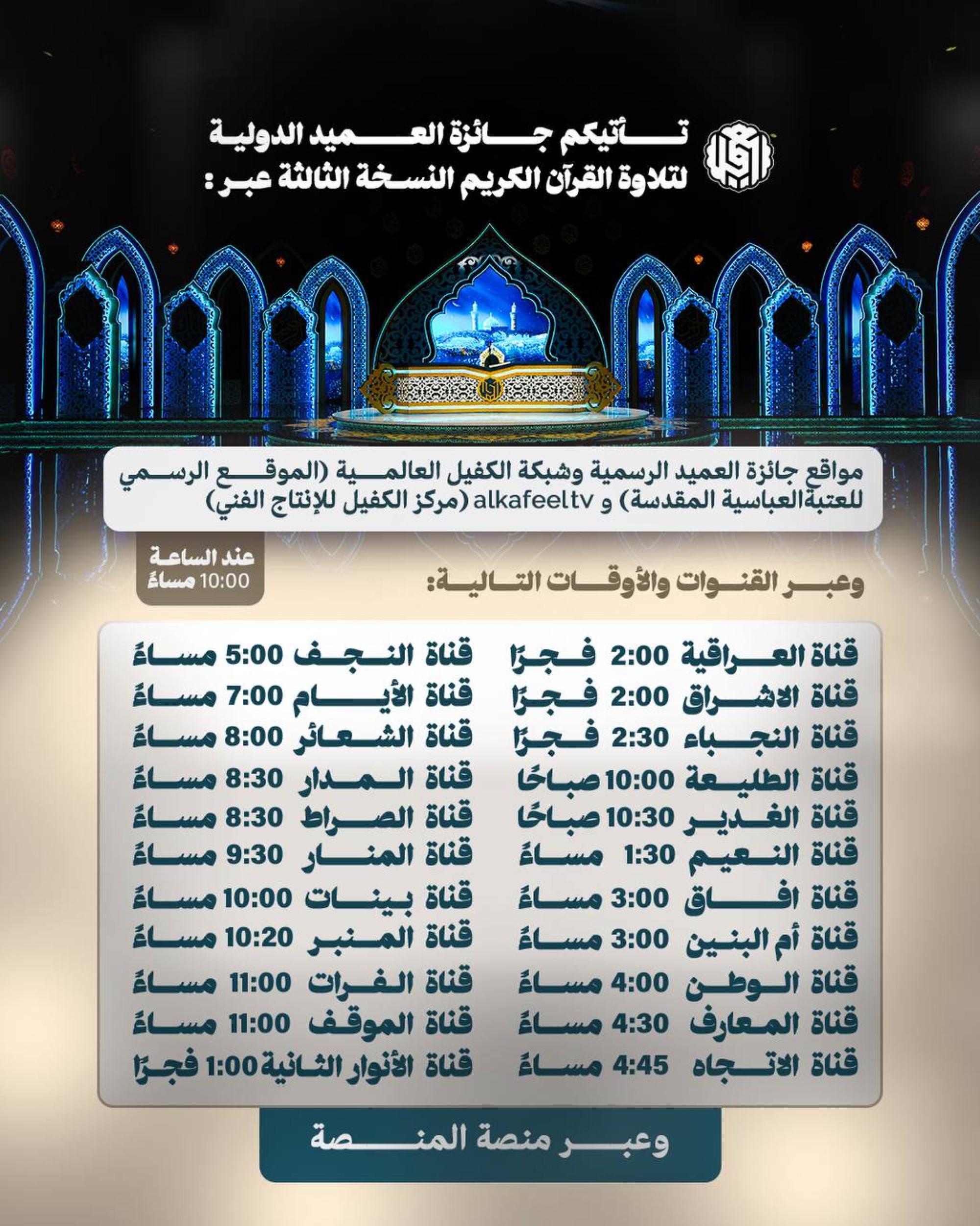 تشارك 22 قناة فضائية بنقل فعاليات النسخة الثالثة من جائزة العميد الدولية لتلاوة القرآن الكريم، وبأوقات مختلفة. وينظم المسابقة المجمع العلمي للقرآن الكريم التابع للعتبة العباسية المقدسة، بمشاركة نخبة من القرَّاء الذين يمثلون عددًا من الدول العربية والإسلامية. القنوات الفضائية الناقلة لفعاليات الجائزة وأوقات العرض: قناة المنار – 9 مساءً. قناة الصراط – 8:30 مساءً. قناة الاتجاه – 4:45 مساءً. قناة المعارف – 4:30 مساءً. قناة العراقية– 2 فجرًا. قناة الفرات – 11 ليلا. قناة الأيام – 7 مساءً. قناة الأنوار الثانية – 1 فجرًا. قناة النعيم – 1:30 مساءً. قناة بينات – 10 ليلا. قناة النجباء – 2:30 صباحًا. قناة الطليعة – 10 صباحًا. قناة الغدير – 10:30 صباحًا. قناة آفاق – 3 مساءً. قناة النجف– 5 مساءً. قناة الإشراق ــ 2 فجرًا. قناة أم البنين ــ 3 مساءً. قناة الوطن ــ 4 مساءً. قناة الشعائر ــ 8 مساءً. قناة المدار ــ 8:30 مساءً. قناة المنبر ــ 10:20 مساءً. قناة الموقف ــ 11 ليلا.