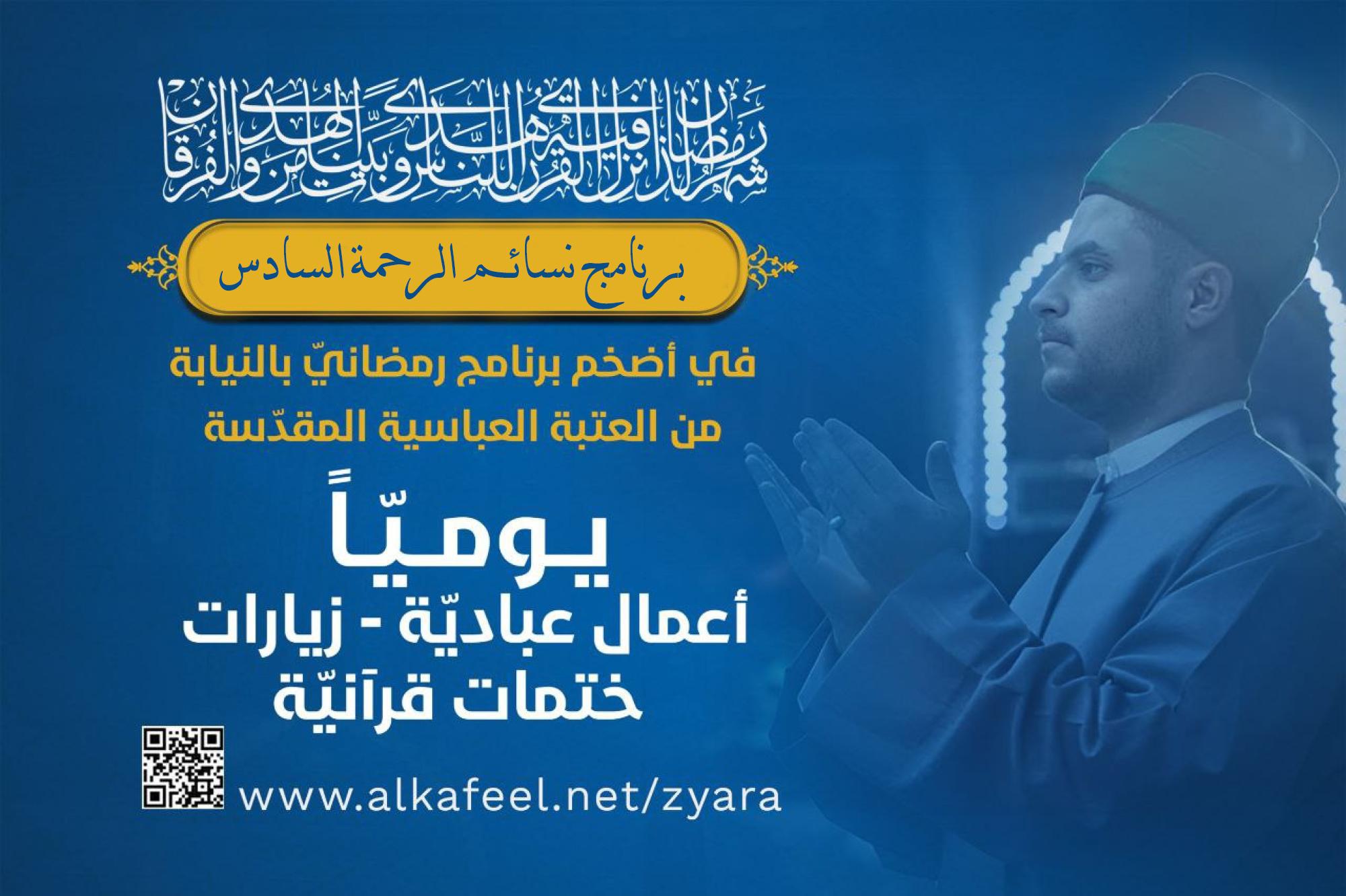 أطلقت شعبة السادة الخدم في العتبة العباسية المقدسة، برنامج نسائم الرحمة الرمضاني بنسخته السادسة. ويقام البرنامج بالتعاون مع شعبة تقنية المعلومات والشبكات التابعة لقسم الإعلام في العتبة المقدسة؛ بهدف إحياء أيام شهر رمضان المبارك ولياليه؛ عَبرَ نافذة الزيارة بالنيابة، المنبثقة من شبكة الكفيل العالمية. وقال مسؤول شعبة السادة الخدم السيد هاشم الشامي، إنَّ الشعبة اعتادت كل عام في شهر رمضان المبارك، على إطلاق برنامج يختص بهذا الشهر الفضيل وتأدية أعماله بالنيابة عن المسجلين في النافذة المخصصة والمنبثقة من شبكة الكفيل العالمية. وأوضح أنَّ البرنامج يضم فقرات متنوعة، يؤديها منتسبو شعبة السادة الخدم، وتستمر طوال أيام شهر رمضان المبارك، وتختتم هذه الأعمال بأداء زيارة الإمام الحسين وأخيه أبي الفضل العبّاس (عليهما السلام) المخصوصة ليلة العيد ويومه.