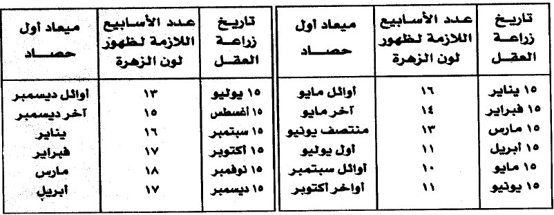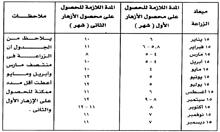 ٣۔ موعد الزراعة: وهو من أهم النقاط ، إذ يمكن بالتحكم في مواعيد الزراعة تحديد ميعاد محصول الأزهار الأول ومحصول الأزهار الثاني ، وذلك بالرجوع إلى الجدول التقريبي التالي:
