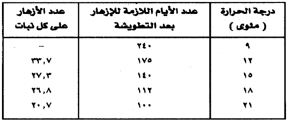 2- درجة الحرارة : تلعب درجة الحرارة السائدة دورا هاما في موعد التزهير، عدد الأزهار الناتجة على كل نبات وكذلك في جودتها، يوضح ذلك الجدول التالي: